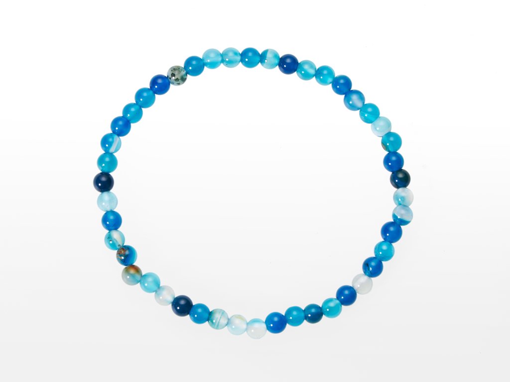 O produktu: Kuličkový náramek je nadčasová klasika. Tento kousek je vyroben z lesklých kuliček modrého achátu o průměru 4 mm. Je navlečený na dvojité elastické gumičce o délce přibližně 18 cm. Je pružný a sedí každé velikosti.