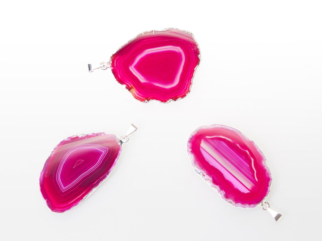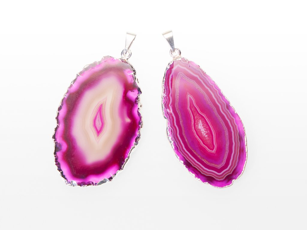 Popis kamene: Pestrobarevné odstíny a působivá páskovaná kresba. To jsou hlavní benefity, které z achátu dělají unikátní kámen oblíbený po celém světě. Jde o odrůdu chalcedonu (obecný název pro vláknitý kryptokrystalický křemen), jež jako většina ostatních pochází z Brazílie. Brazilské acháty jsou porézní a dobře absorbují barviva v roztocích. V tomto případě byl achát barven růžovou barvou, která se při barvení vpíjí s odlišnou intenzitou do jednotlivých vrstviček a vytváří tak na povrchu krásné proužkované vzory.
