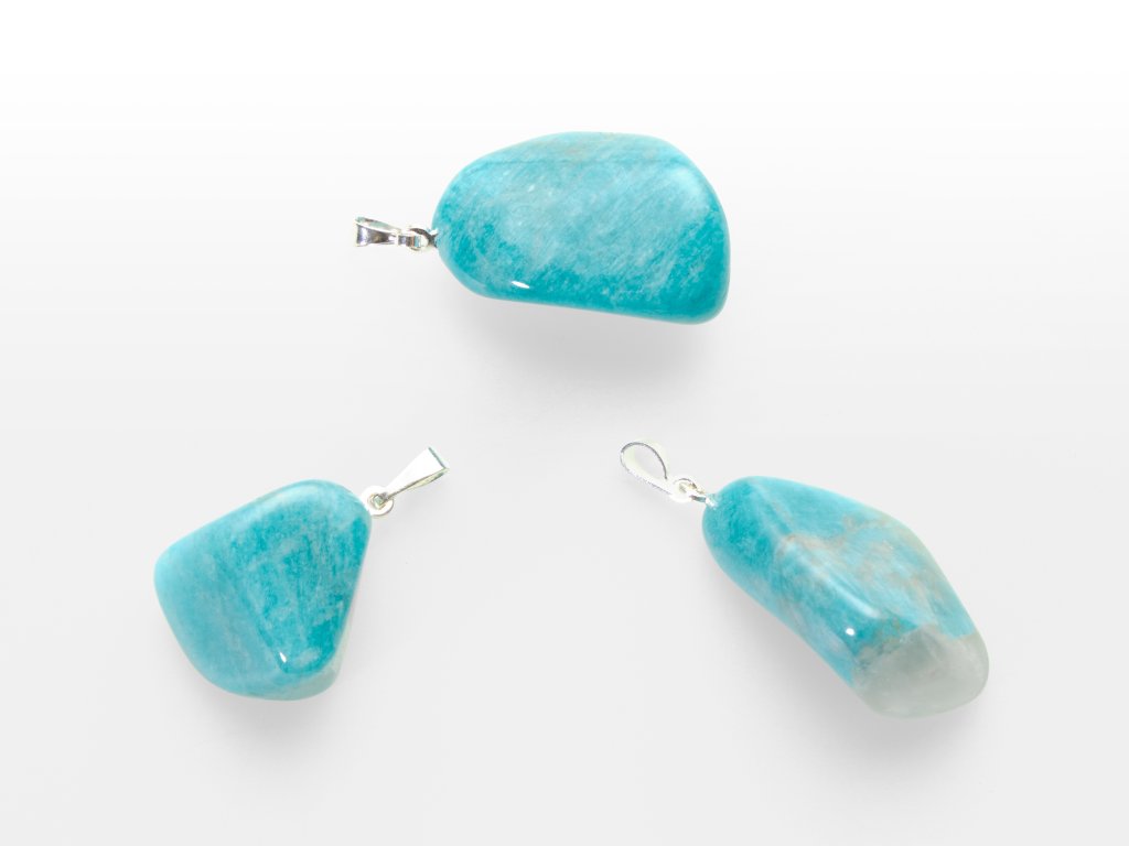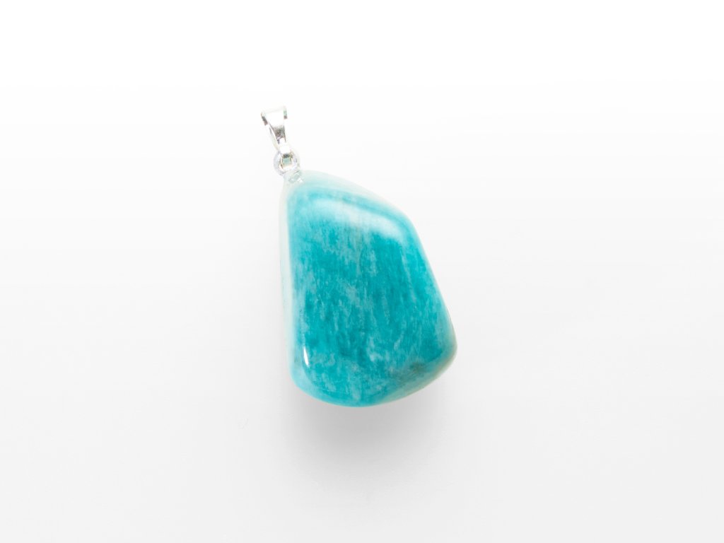 Popis kamene: Minerál pojmenovaný podle nalezišť v poříčí Amazonky. Amazonit se může vyjímat ve smaragdově zelených až modrozelených tónech. Bohužel dnes se už jen velmi malá část pyšní sytě zelenými barvami. Surovina pochází z dolů státu Minas Gerais v Brazílii. Z hlediska složení jde o vzácnou zelenou odrůdu draselného živce mikroklínu, která obsahuje malé množství oxidu rubidia. Amazonit použitý k výrobě přivěsku je kvality extra - zaujme výraznějšími barvami.
