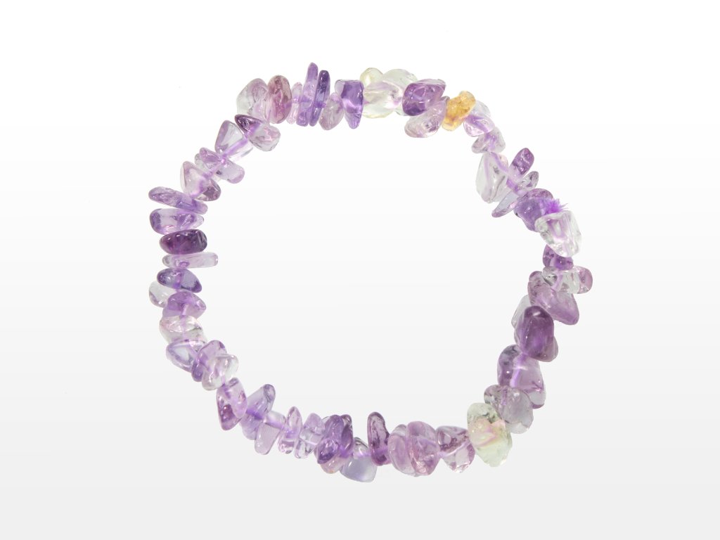 O produktu: Sekané náramky jsou neprodávanějším druhem šperku z minerálů. Tento je vyroben z drobných ohlazených úlomků ametrínu. Každý kamínek má jiný tvar, šperk je tedy vhodný pro ty, co dávají přednost kouzlu nahodilosti před pravidelností. Náramky jsou navlečeny na dvojité elastické gumičce o délce přibližně 19 cm. Jsou pružné a sedí každé velikosti.