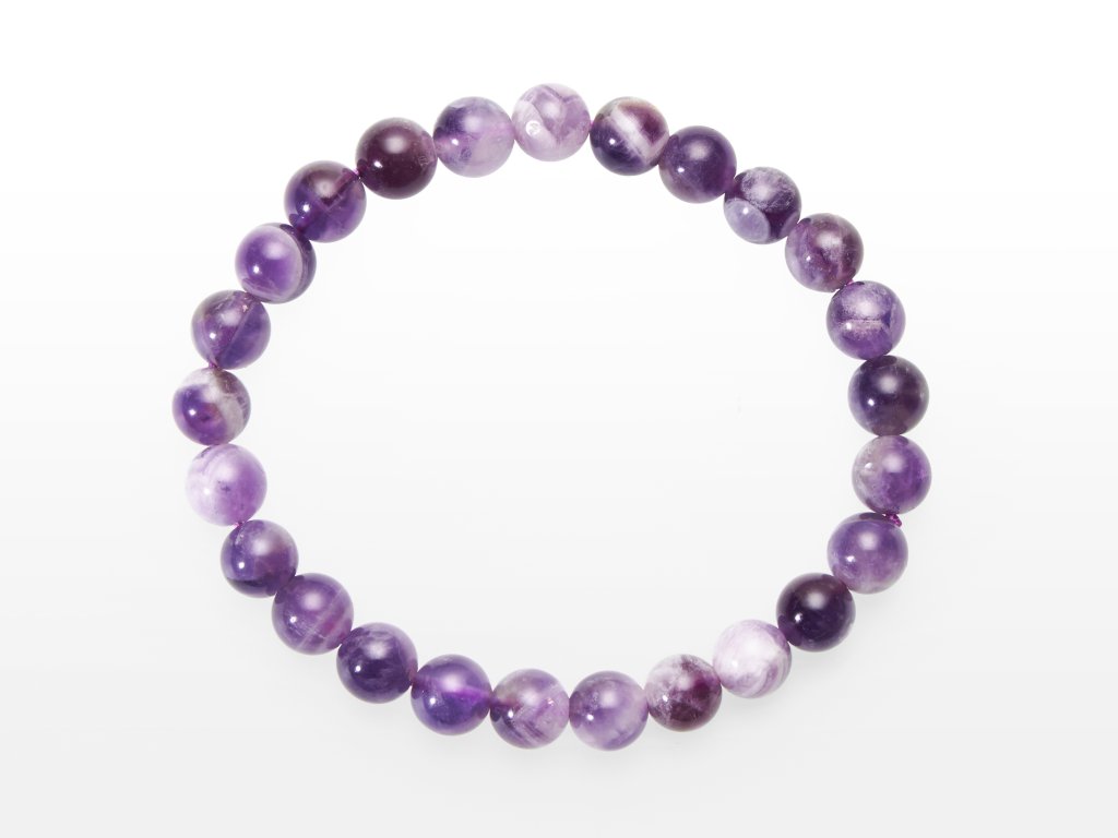 O produktu: Kuličkový náramek je nadčasová klasika. Tento kousek je vyroben z lesklých kuliček ametystu chevron o průměru 8 mm. Je navlečený na dvojité elastické gumičce o délce přibližně 19 cm. Je pružný a sedí každé velikosti.