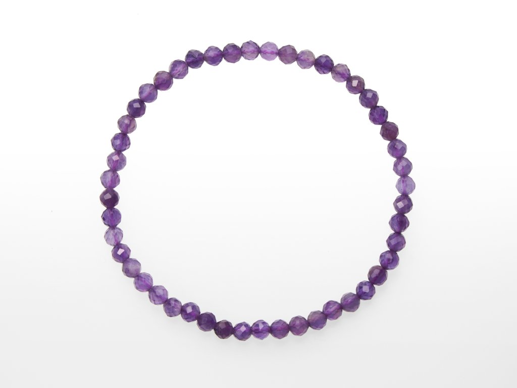 O produktu: Náramek z fazetovaných kuliček ametystu o průměru 4 mm. Fazetování je proces vybrušování hladkých plošek mnohoúhelníkového tvaru. Tato úprava dodává kuličkám výjimečný třpyt – fazetované náramky jsou tak elegantním doplňkem vhodným i ke společenskému oděvu. Kuličky jsou navlečeny na dvojité elastické gumičce o délce přibližně 18 cm, jsou pružné a sedí každé velikosti.
