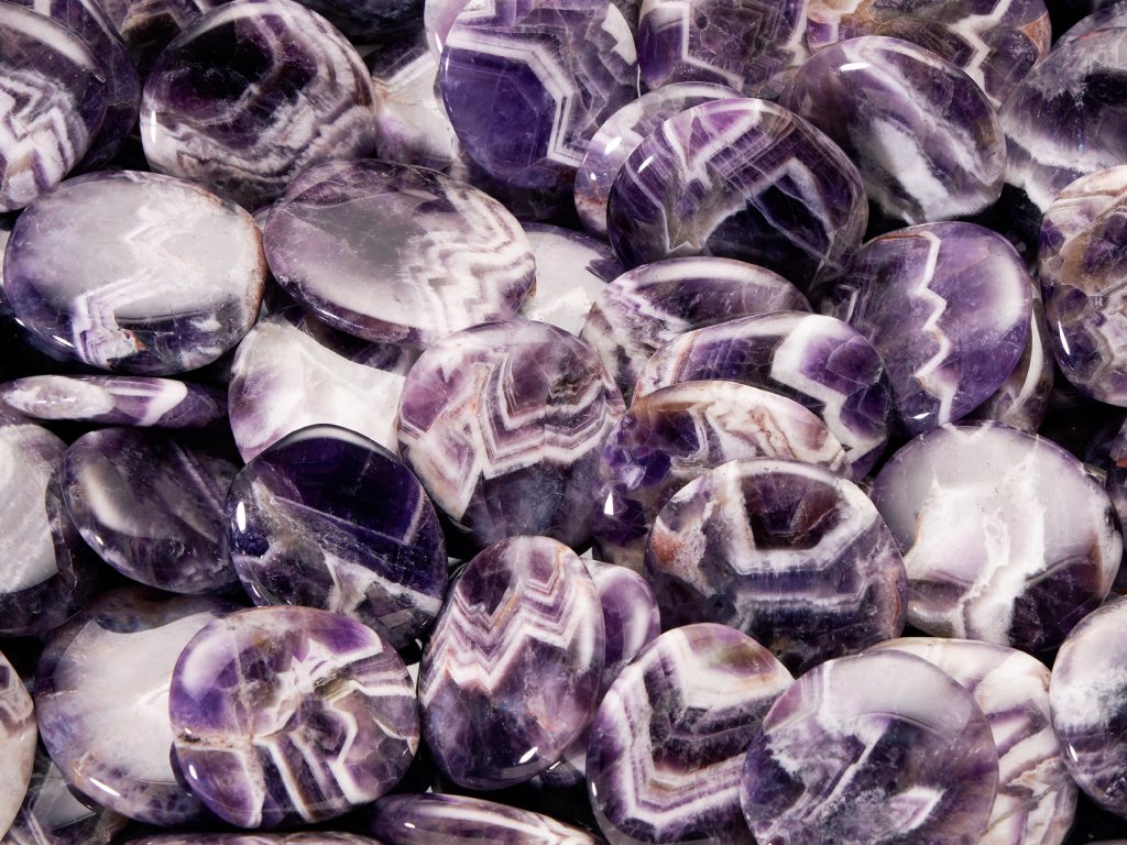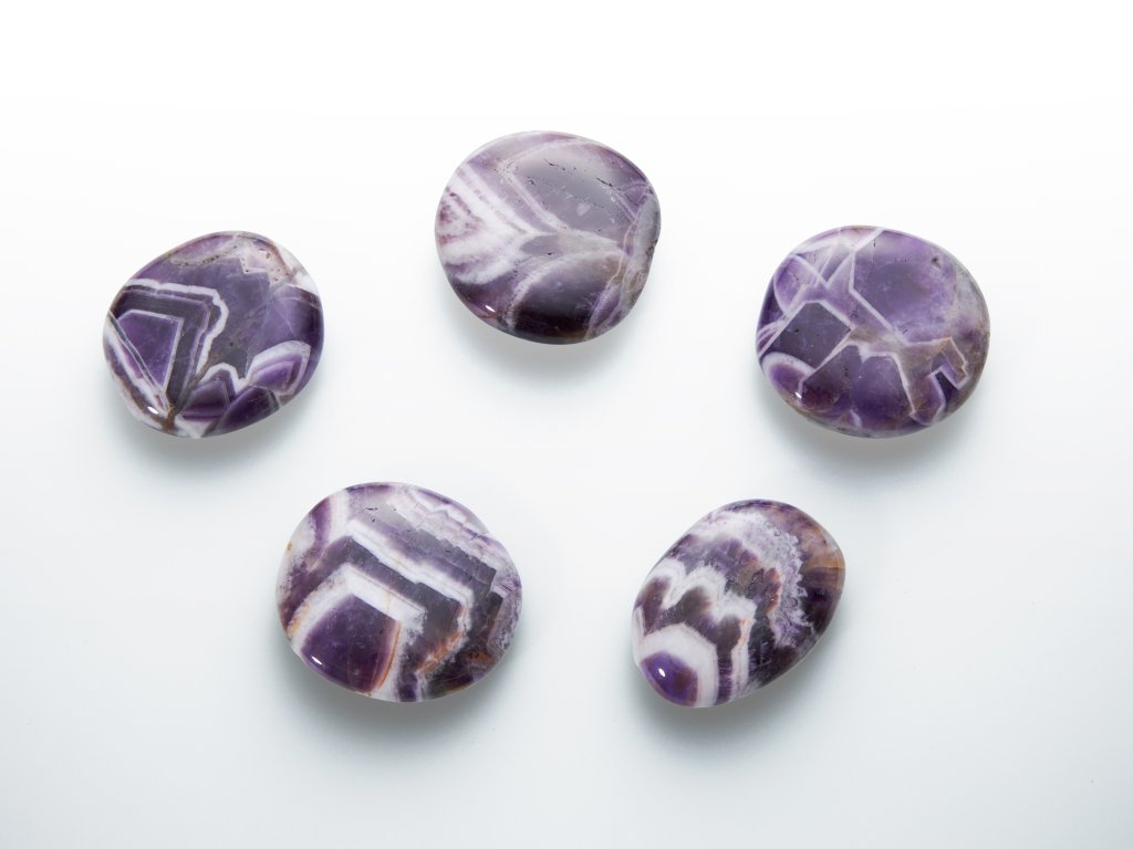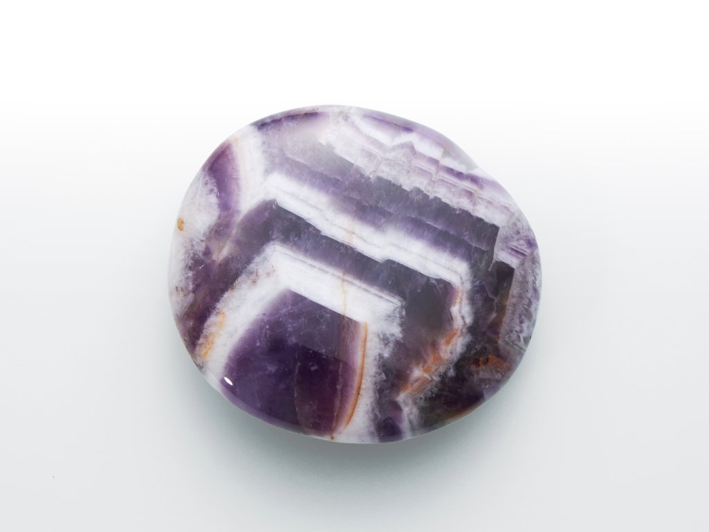 Popis kamene: Ametyst je už od starověku ceněný pro svou půvabnou fialovou barvu a je oblíbeným materiálem pro výrobu různých ozdob a šperků. Ametyst zebra, nebo také chevron, poutá svým specifickým ornamentem ve tvaru „V“, podle něhož dostala i název. Vzniká postupnou krystalizací z hydrotermálních roztoků, při které se s geometrickou pravidelností vylučuje bílý křemen a fialový ametyst. Nahrazuje na trhu momentálně nedostupnou surovinu z namibijských dolů. Osobitost tohoto ametystu tkví v intenzivním proužkování a tmavě fialové barvě, které dohromady vytváří krásný kontrastní vzor a velmi atraktivní vzhled.