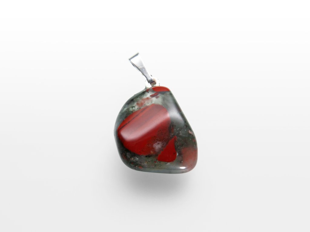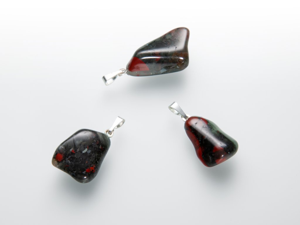 Popis kamene: Kámen v šedých a šedozelených odstínech, které krásně doplňují červené zóny způsobené drobnými úlomky jaspisu. Některé heliotropy obsahují i třpytivá zrna pyritu. Surovina pochází z pohoří Barbeton v Jihoafrické republice. Z hlediska složení se jedná o odrůdu chalcedonu.