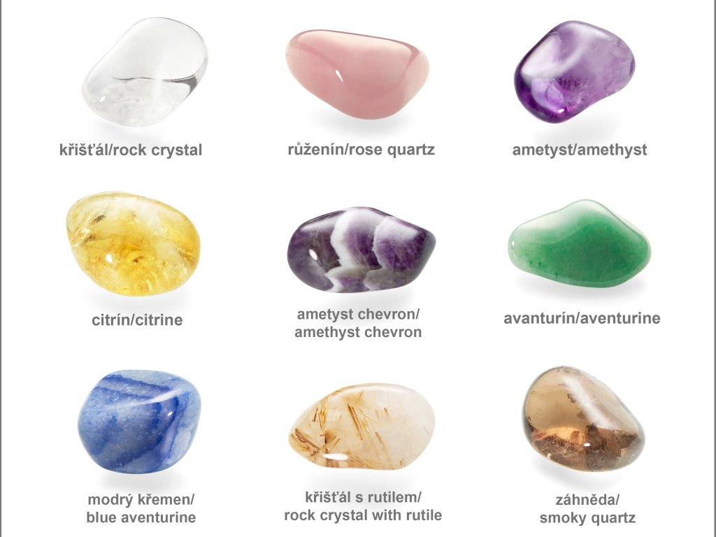 V této sbírce najdete devět nejoblíbenějších druhů křemene: křišťál, růženín, ametyst, citrín, ametyst chevron, avanturín, modrý křemen, křišťál s rutilem a záhněda.