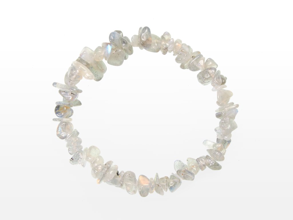 O produktu: Sekané náramky jsou neprodávanějším druhem šperku z minerálů. Tento je vyroben z drobných ohlazených úlomků labradoritu. Každý kamínek má jiný tvar, šperk je tedy vhodný pro ty, co dávají přednost kouzlu nahodilosti před pravidelností. Náramky jsou navlečeny na dvojité elastické gumičce o délce přibližně 19 cm. Jsou pružné a sedí každé velikosti.