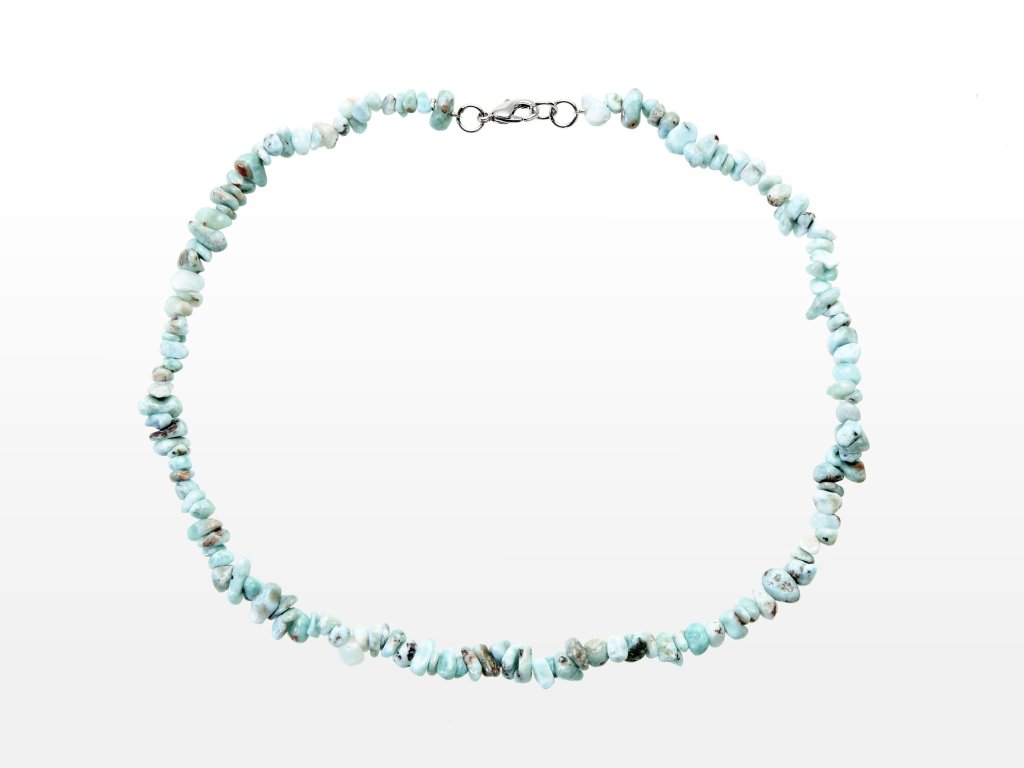 O produktu: Náhrdelník vyrobený z drobných ohlazených úlomků larimaru. Díky nepravidelnému tvaru a rozmanitosti minerálů je každý náhrdelník naprostým unikátem - skvělá volba pro ty, kteří hledají ležérní, a přesto elegantní doplněk s přírodním šarmem pro každodenní nošení. Náhrdelníky mají délku 40-45 cm a jsou ukončené zapínáním ze stříbřeného tombaku. Šperk neobsahuje nikl, je tedy vhodný i pro citlivou pokožku.