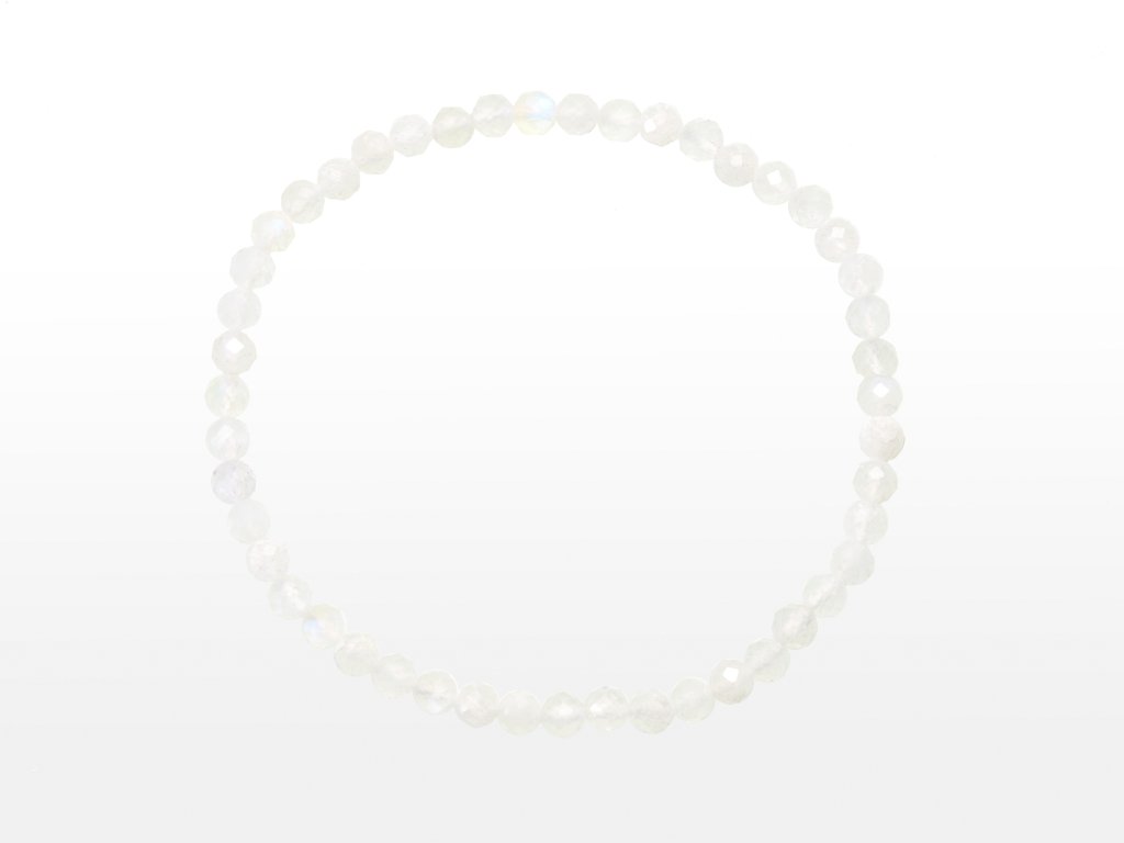 O produktu: Náramek z fazetovaných kuliček bílého měsíčního kamene o průměru 4 mm. Fazetování je proces vybrušování hladkých plošek mnohoúhelníkového tvaru. Tato úprava dodává kuličkám výjimečný třpyt – fazetované náramky jsou tak elegantním doplňkem vhodným i ke společenskému oděvu. Kuličky jsou navlečeny na dvojité elastické gumičce o délce přibližně 18 cm, jsou pružné a sedí každé velikosti.