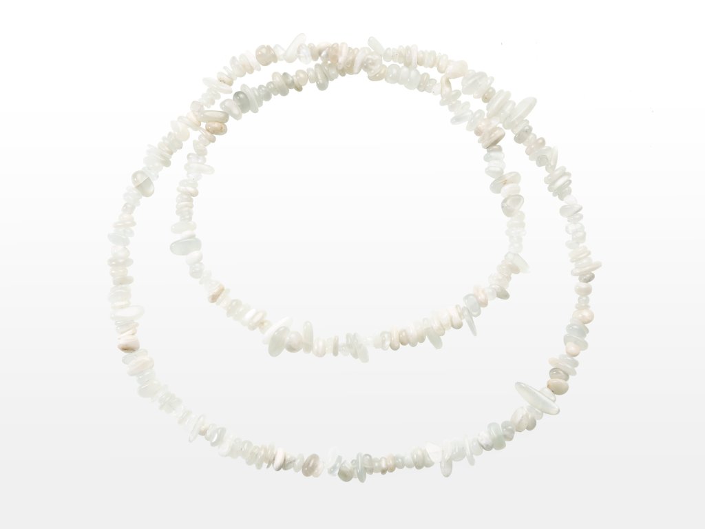 O produktu: Dlouhý náhrdelník vyrobený z drobných ohlazených úlomků bílého měsíčního kamene. Díky nepravidelnému tvaru a rozmanitosti minerálů je každý náhrdelník naprostým unikátem - skvělá volba pro ty, kteří hledají ležérní, a přesto elegantní doplněk s přírodním šarmem pro každodenní nošení. Dlouhé náhrdelníky nemají kovové zapínání, jejich délka 80-90 cm totiž umožňuje jednoduché navlékání přes hlavu.