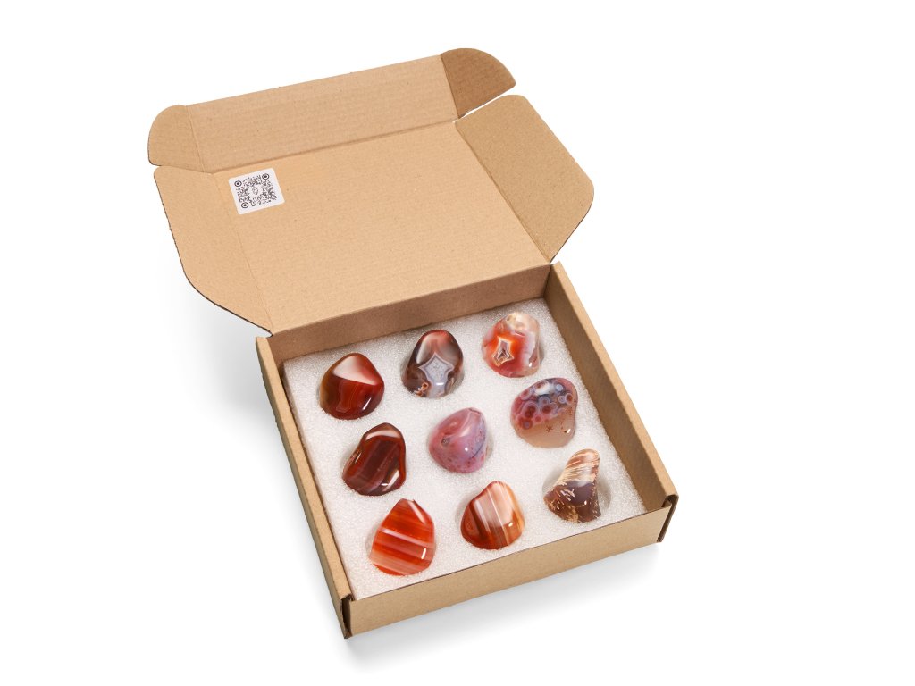 Kameny jsou uloženy v elegantní a pevné dárkové krabičce z kvalitní lepenky. Díky praktickému zavírání a speciálnímu polstrování jsou kameny chráněny z obou stran, nemusíte se tak obávat poškození či rozsypání při přepravě.