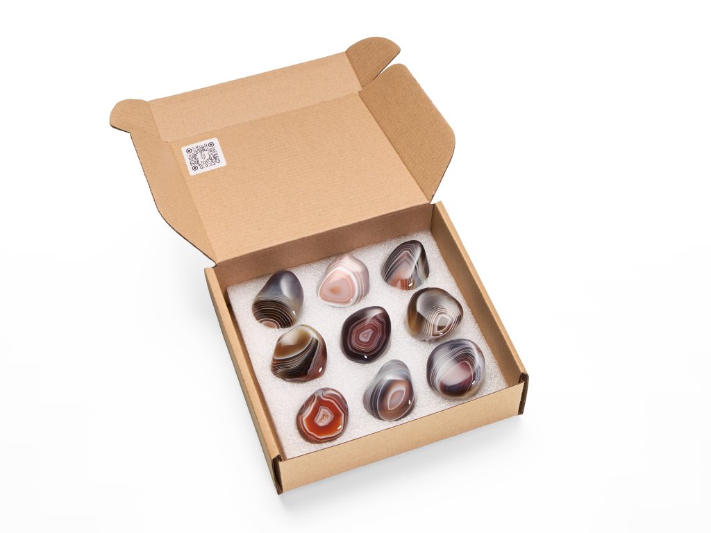 Bonus pro vás: Na vnitřní straně víčka najdete QR kód, který vás okamžitě navede na speciální webovou stránku se zajímavými informacemi o původu a vzniku botswanských achátů.