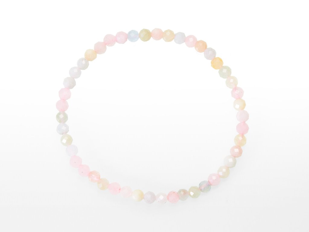 O produktu: Náramek z fazetovaných kuliček barevného morganitu o průměru 4 mm. Fazetování je proces vybrušování hladkých plošek mnohoúhelníkového tvaru. Tato úprava dodává kuličkám výjimečný třpyt – fazetované náramky jsou tak elegantním doplňkem vhodným i ke společenskému oděvu. Kuličky jsou navlečeny na dvojité elastické gumičce o délce přibližně 18 cm, jsou pružné a sedí každé velikosti.