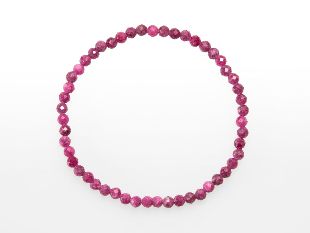 O produktu: Náramek z fazetovaných kuliček rubínu o průměru 4 mm. Fazetování je proces vybrušování hladkých plošek mnohoúhelníkového tvaru. Tato úprava dodává kuličkám výjimečný třpyt – fazetované náramky jsou tak elegantním doplňkem vhodným i ke společenskému oděvu. Kuličky jsou navlečeny na dvojité elastické gumičce o délce přibližně 18 cm, jsou pružné a sedí každé velikosti.