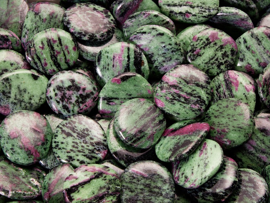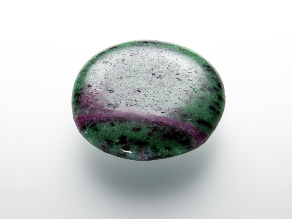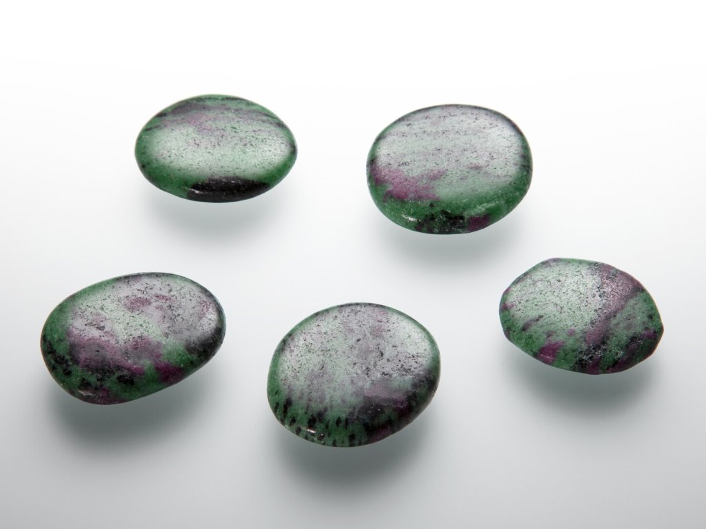 Popis kamene: Dvoubarevná specialita, která v sobě ukrývá červený rubín zarůstající do sytě zelené zoisitové matrice. Rubín zoisit se těží ve dvou nalezištích v Tanzanii - ta jsou ovšem dnes již z velké části vyčerpána, proto cena kvalitní suroviny neustále stoupá. Z hlediska složení představuje rubín drahokamovou odrůdu korundu – oxidu hlinitého. Zoisit je pak křemičitan vápníku a hliníku, blízký epidotu.