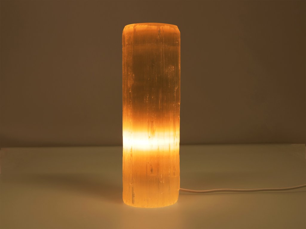 O produktu: Tato jedinečná lampa je vyrobena z jednoho velkého selenitového krystalu šetrným opracováním do tvaru válce o výšce přibližně 40 cm. Ze spodní strany je vyvrtaný otvor pro světelný zdroj. Dodáváme s kabelem a 15W žárovkou. Lampa vyzařuje jemné, uklidňující světlo, ideální pro odpočinek a meditaci.