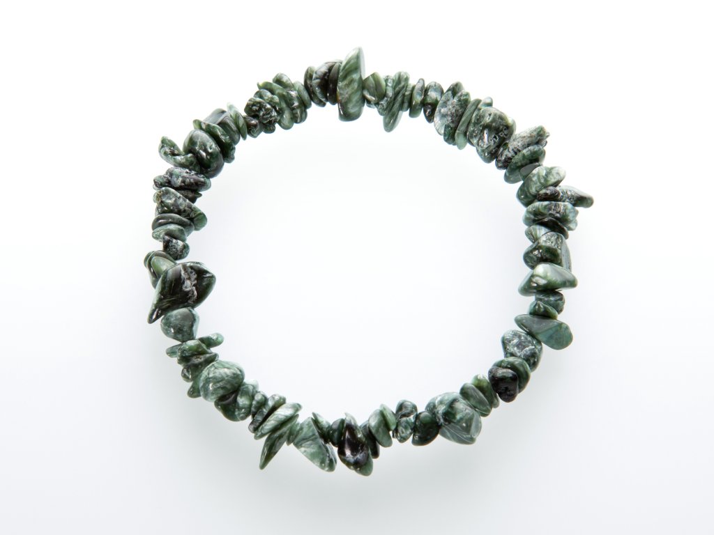 O produktu: Sekané náramky jsou neprodávanějším druhem šperku z minerálů. Tento je vyroben z drobných ohlazených úlomků serafinitu. Každý kamínek má jiný tvar, šperk je tedy vhodný pro ty, co dávají přednost kouzlu nahodilosti před pravidelností. Náramky jsou navlečeny na dvojité elastické gumičce o délce přibližně 19 cm. Jsou pružné a sedí každé velikosti.