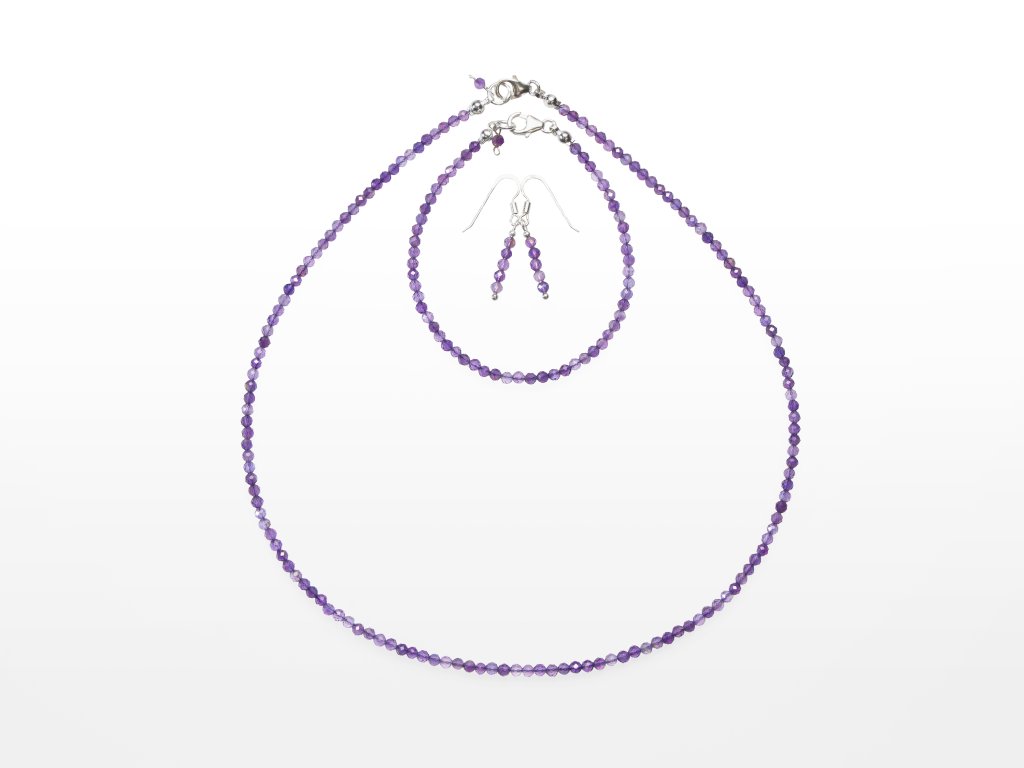 Stříbrná sada šperků ametyst fazetovaný 3 mm (náhrdelník + náramek + náušnice)