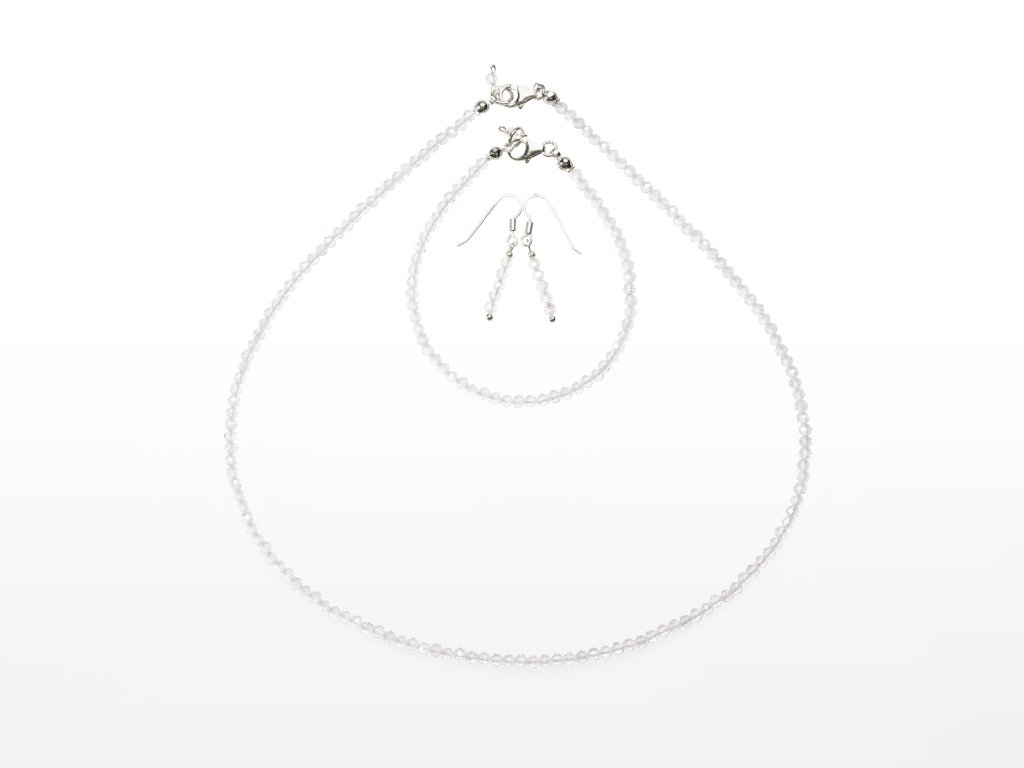 O produktu: Set obsahuje stříbrný náhrdelník, náramek a náušnice s precizně fazetovanými kuličkami minerálu o velikosti 3 mm. Šperky jsou pečlivě vyrobeny v naší dílně ze stříbrných komponentů ryzosti 925/1000. Náhrdelník a náramek jsou navlečeny na pevném lanku z nerezové oceli a zakončeny kvalitním stříbrným zapínáním. Visací náušnice jsou navlečeny na stříbrném ketlovacím nýtu a zakončeny stříbrným afroháčkem. Délka náhrdelníku je 45 cm, délka náramku 19,5 cm. Sadu šperků zasíláme v dárkovém balení.
