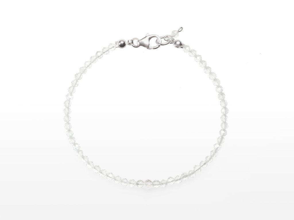 O produktu: Objevte eleganci v každém detailu se stříbrným náramkem z naší vlastní výroby. Precizně fazetované kuličky minerálu o velikosti 3 mm dodávají šperku nezaměnitelný třpyt a šarm. Šperk je pečlivě navlečen na pevném lanku z nerezové oceli a zakončen kvalitním zapínáním ze stříbra ryzosti 925/1000. Náramek má délku 19,5 cm. Všechny stříbrné šperky zasíláme v dárkovém balení.