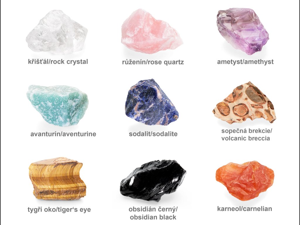 Tato sada obsahuje tyto oblíbené druhy kamenů: křišťál, růženín, ametyst, avanturín, sodalit, sopečná brekcie, tygří oko, obsidián černý a karneol.