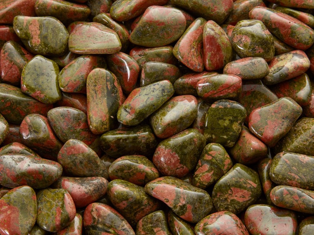 Popis kamene: V unakitu se snoubí zelený epidot, růžový živec a křemen. Díky svému složení obsahuje opravdu působivou kresbu, která se hodí při výrobě šperků, přírodních obkladů a sošek. Pojmenován byl podle původního naleziště v pohoří Unaka v USA. Surovina pochází z JAR.